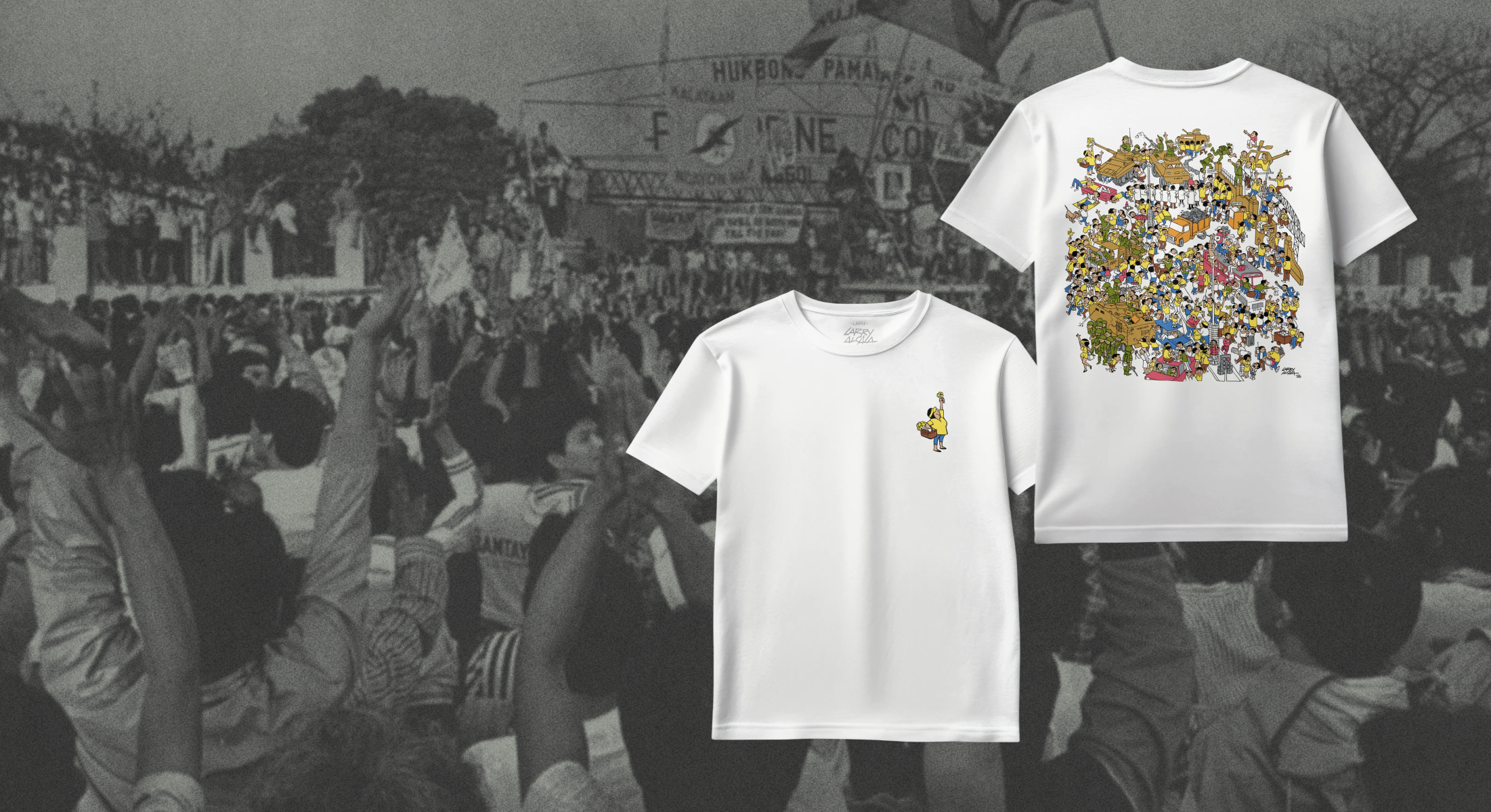 A wearable reproduction of National Artist Larry Alcala’s iconic Slice of Life work, People’s Power (1986), to commemorate the 40th anniversary of the EDSA People Power Revolution and Larry Alcala’s 100th birthday this year.