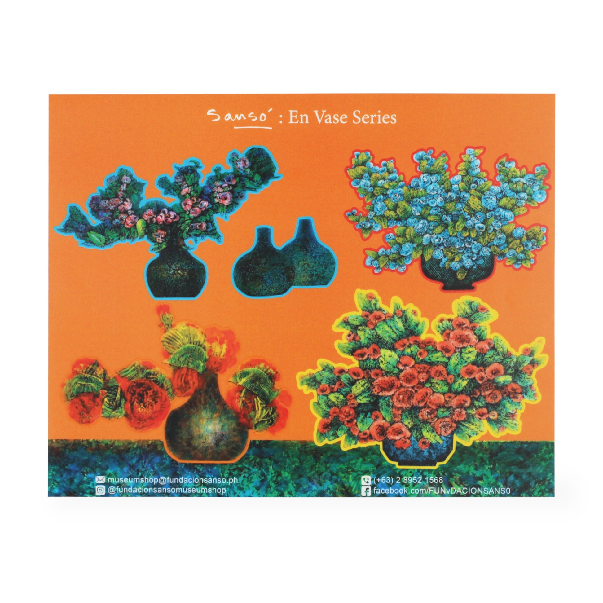 A sticker sheet filled with Juvenal Sansó's En Vase artworks.