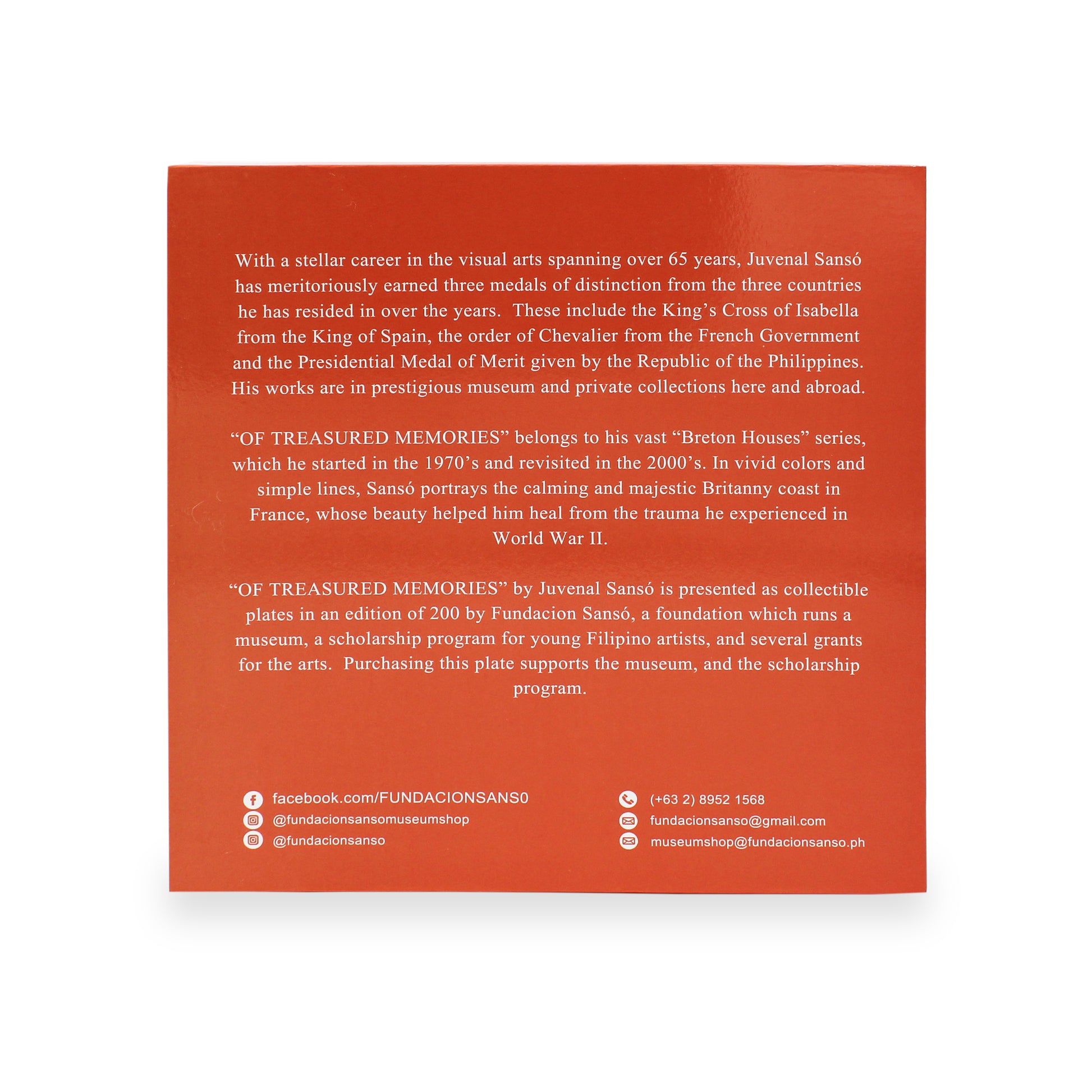 “OF TREASURED MEMORIES '' belongs to his vast “Breton Houses” series, which he started in the 1970’s and revisited in the 2000’s. In vivid colors and simple lines, Sansó portrays the calming and majestic Brittany coast in France, whose beauty helped him heal from the trauma he experienced in World War II. “OF TREASURED MEMORIES” by Juvenal Sansó is presented as collectible plates in an edition of 200 by Fundacion Sansó, a foundation which runs a museum, a scholarship program for young Filipino artists, and several grants for the arts.
