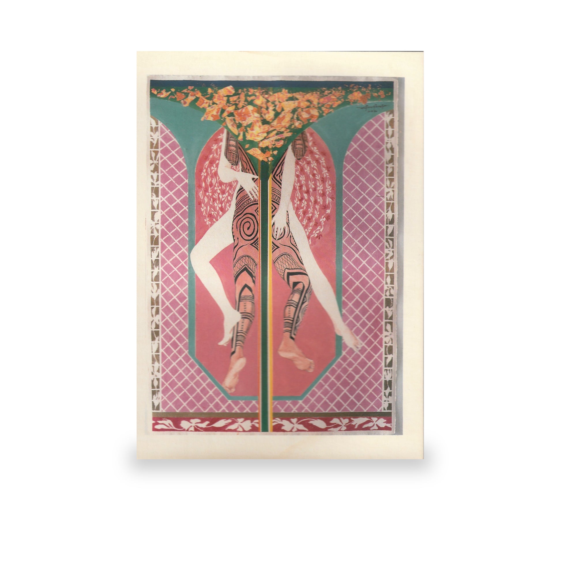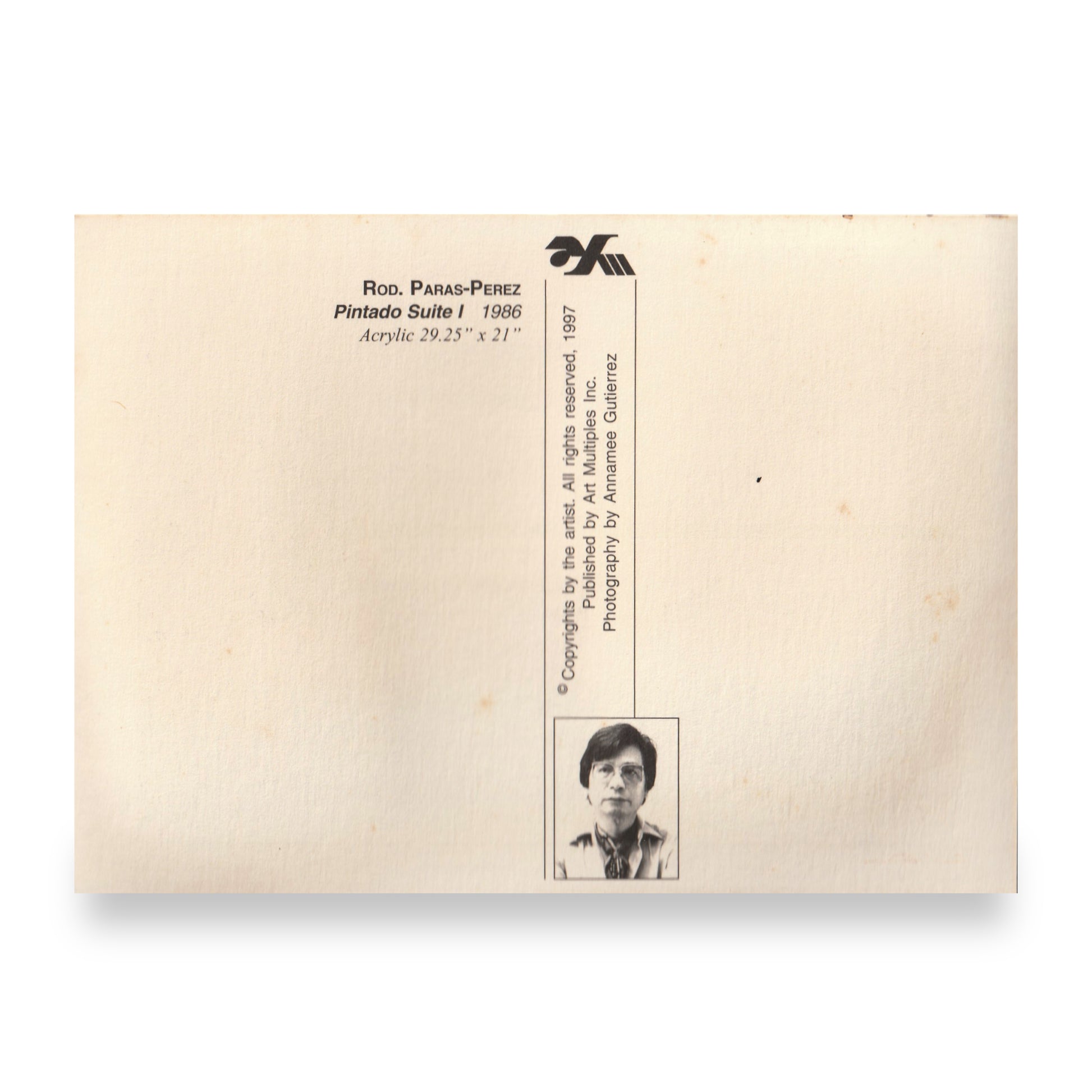 An out-of-print postcard based on an artwork by Rod. Paras-Perez entitled "Pintado Suite I" 1986 , woodcut 29.25"x21" , Acrylic.