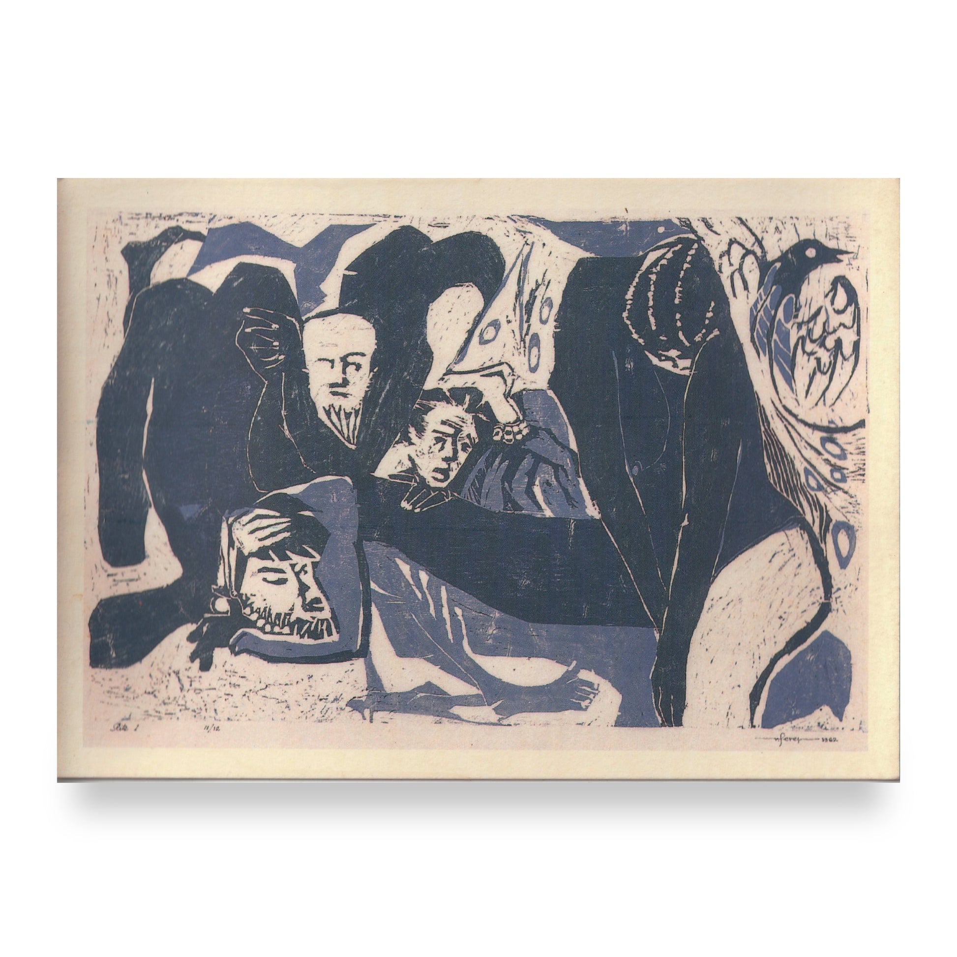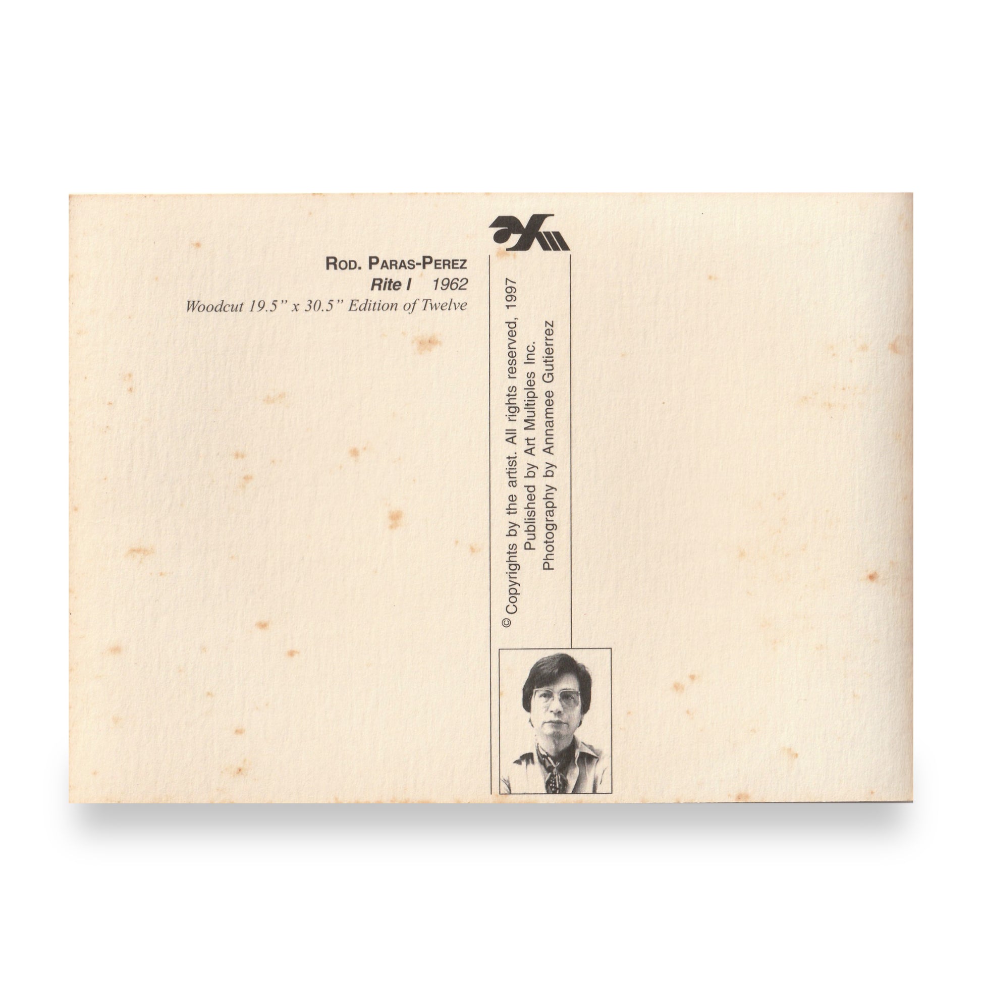 An out-of-print postcard based on an artwork by Rod. Paras-Perez entitled "Rite I" 1962 , woodcut 19.5"x30.5" , Edition of 12.