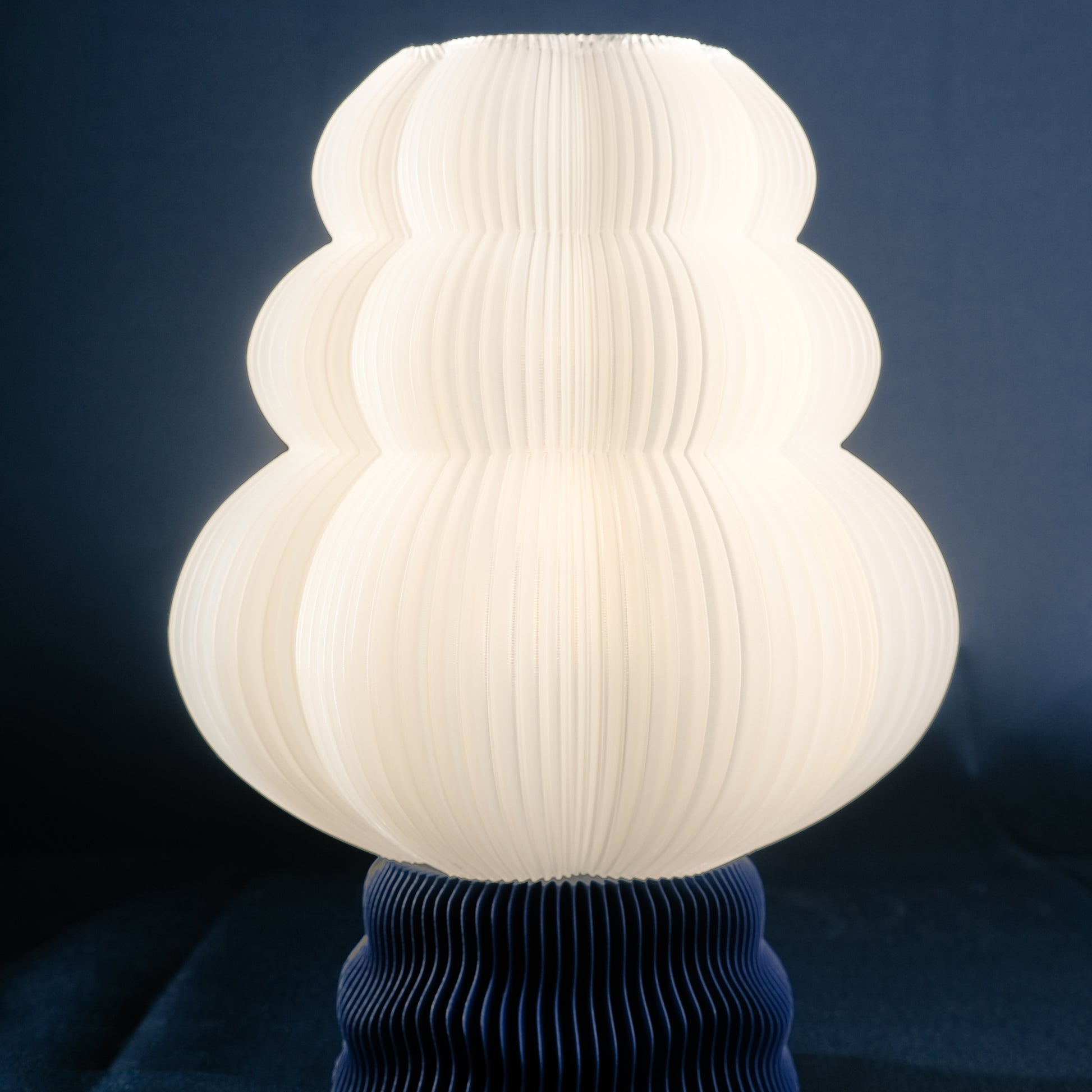 Materials: Renewable PLA shade and base; 3D Printed baseplate, black and white TPE cord