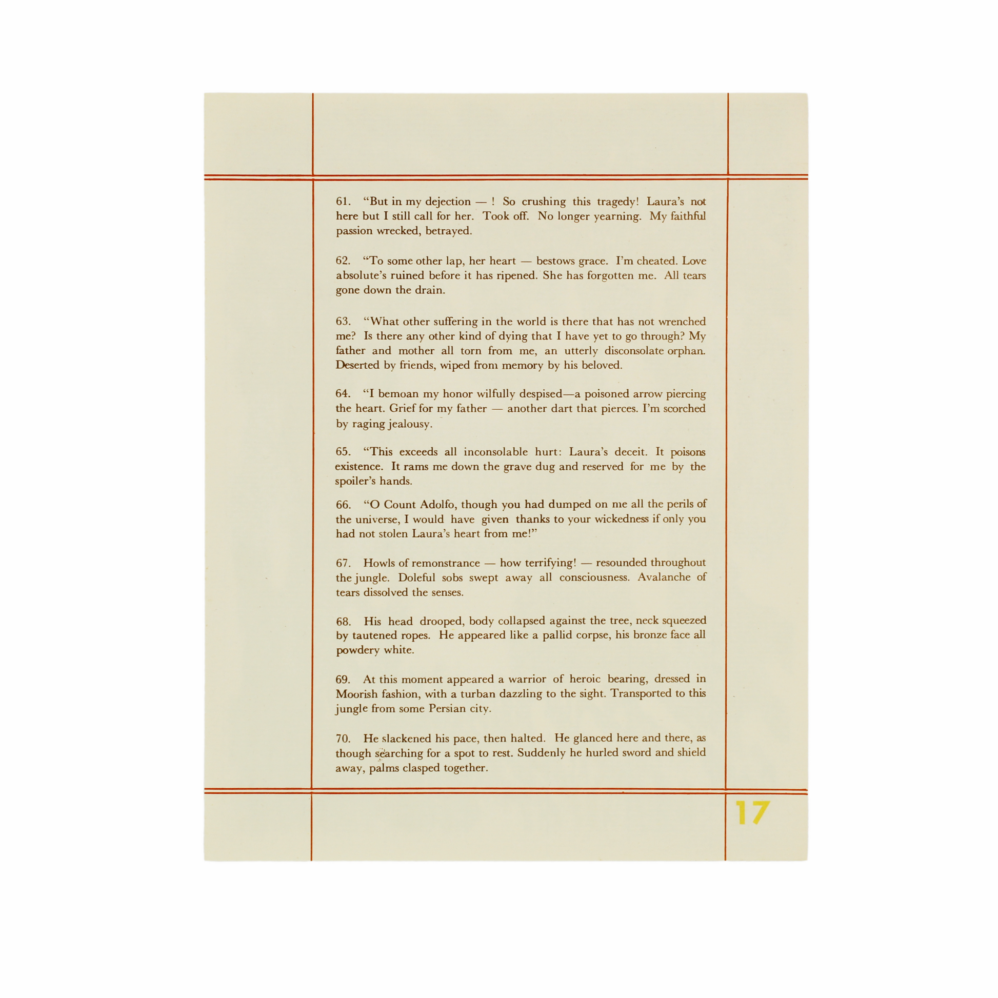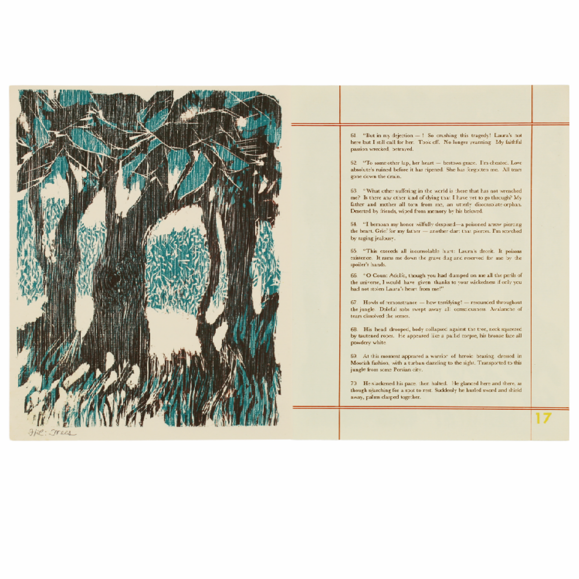This is a 1977 woodblock (xylograph) print, illustrating specific stanzas from the epic poem to accompany E. San Juan Jr.'s English translation of Francisco Balagtas's Florante at Laura